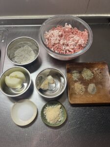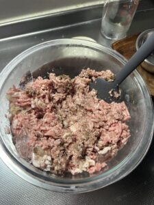 玉ねぎ、ニンニクはすりおろしてすべての材料をボールに加え混ぜ込みます