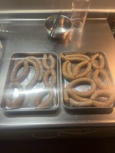 豚ひき肉・豚背油・ケーシング(羊の腸)・ニンニク・玉ねぎ・塩・砂糖・氷水