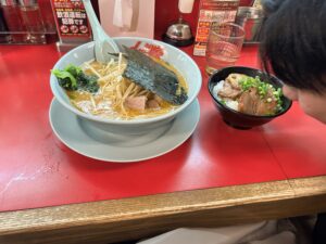 山岡家で食べたのは、特製ネギ味噌ラーメンとチャーシュー丼を食べました。思ったより油こかったですがたですが美味しかったです。