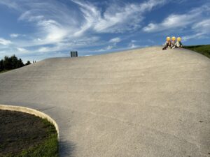 その公園には山と滑り台が合体したような大きな丘があり滑ることができます。結構な斜面で子供たちだけで滑ってもスピードが出てみんな大はしゃぎ!自分も一緒に何回も滑って楽しみました。すると長男がお尻を見てニヤニヤと笑っていて何かついてるのかなと思い確認すると…摩擦でお尻部分が破けていました。。笑