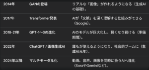 AIの簡単な年表をGeminiに生成してもらった表が以下です。