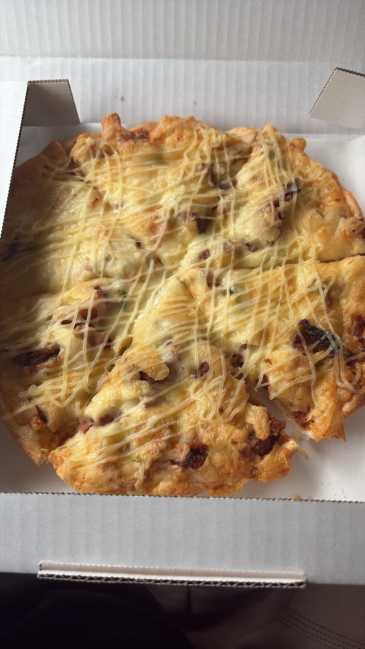 チャイニーズピザ頼みました!普通のピザとは違って中にお肉がが入ってるみたいでした!ピザずっと食べたくて!